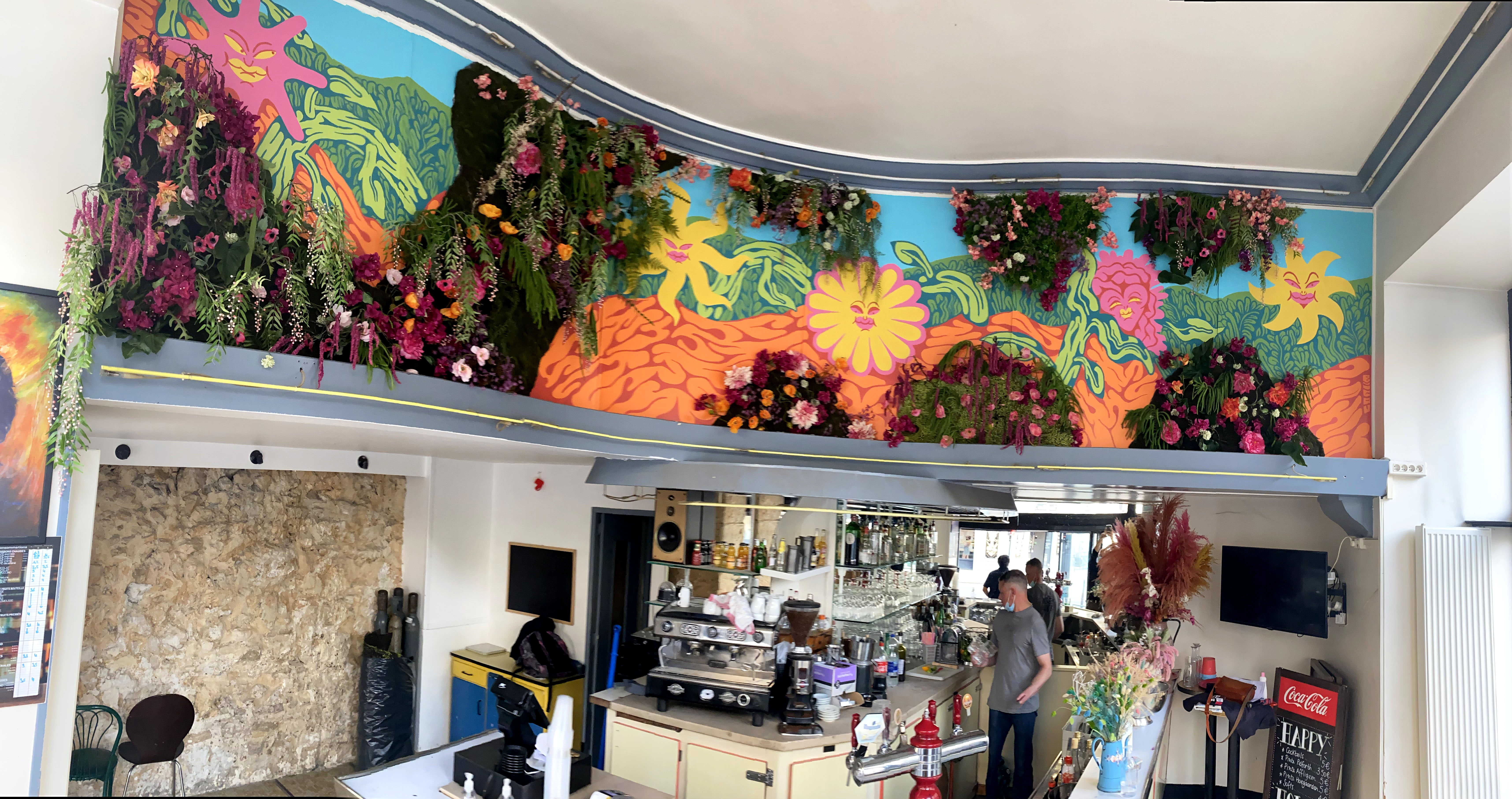 Scratch Paper exhibition, collaborative mural with le 9ème Concept, Fluctuart, Paris Mural at le Bailly bar, in collaboration with Sylvine Fleurs, Paris2019 :